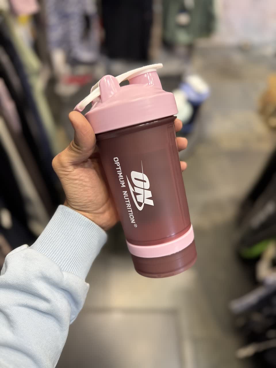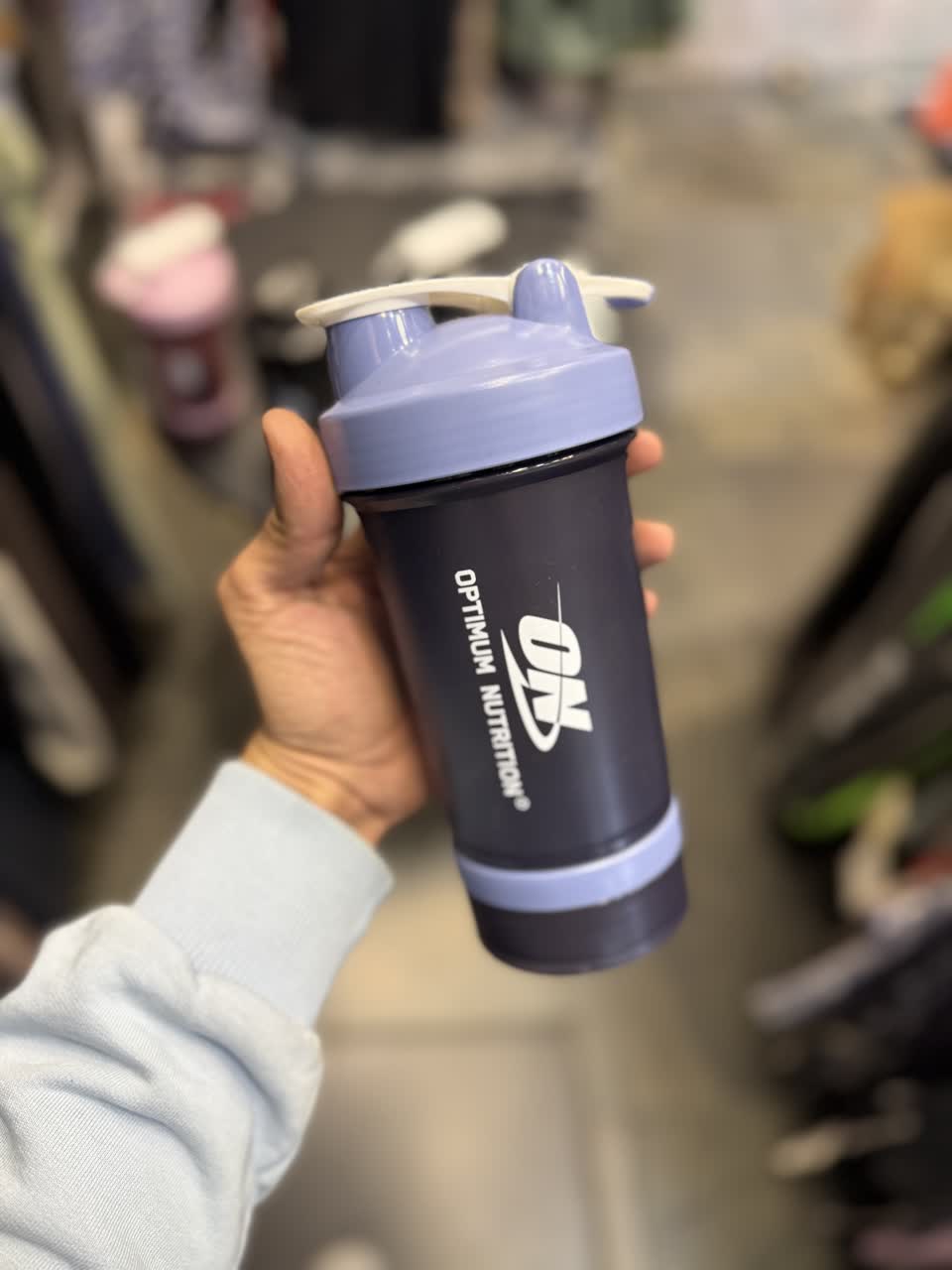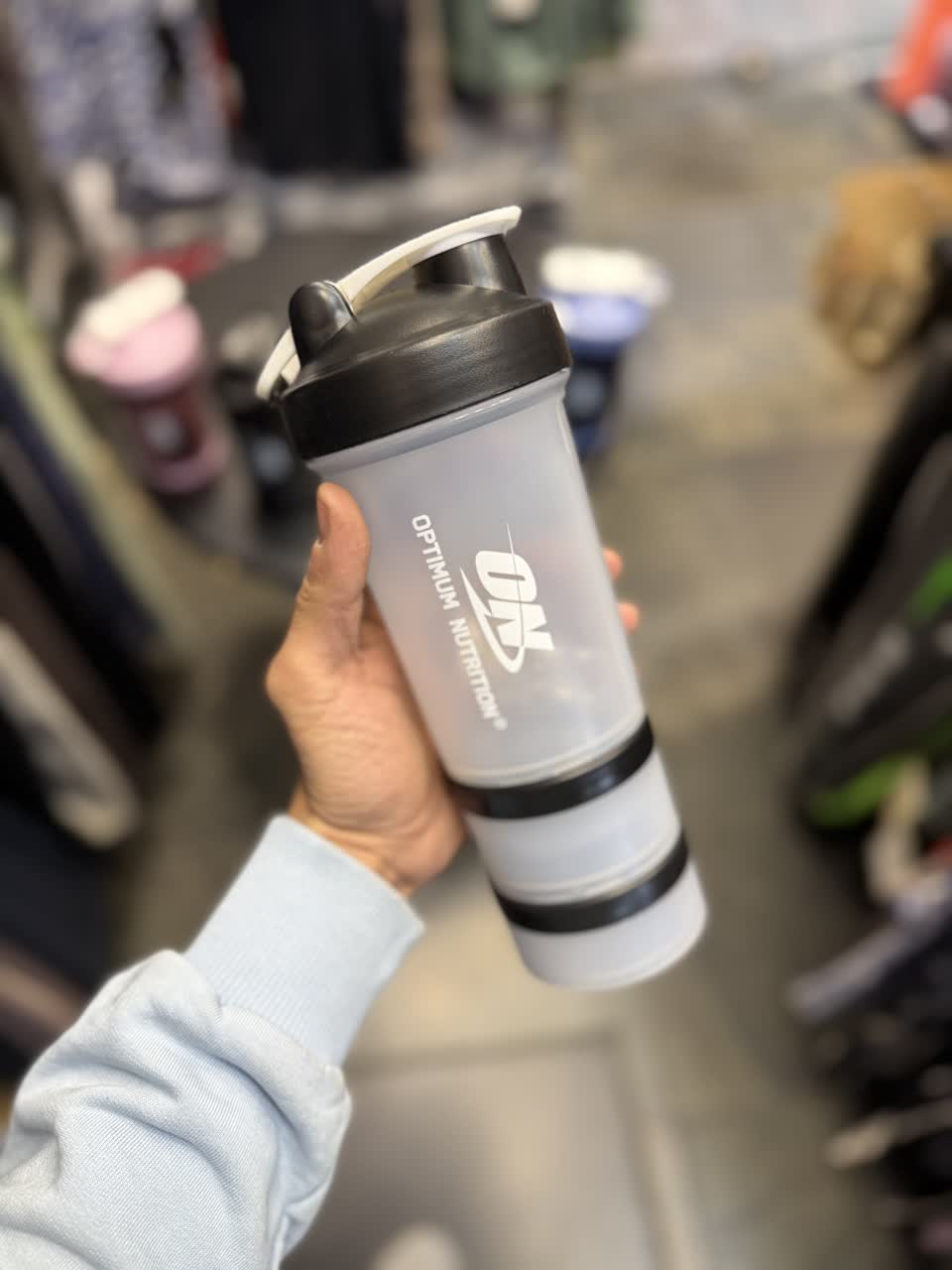 برند: ON وارداتی حجم 500 میل دارای دو جای پودر و قرص دارای توپ همزن دارای دستگیره حمل درب پرسی بدون نشتی bpa free در 5 رنگ ابعاد ارتفاع 22 قطر 8